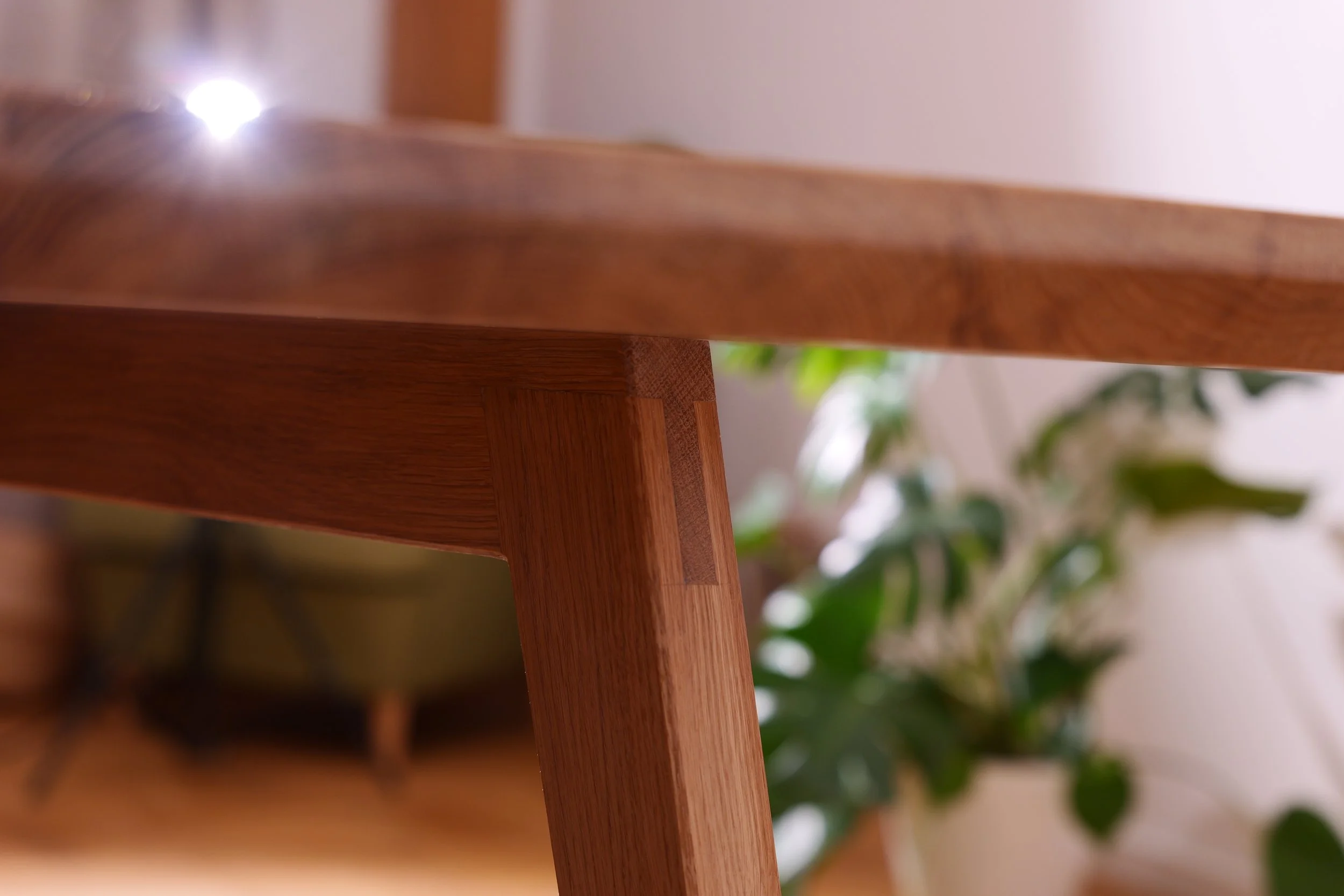 Exklusiv auf Kundenwunsch. Gefertigt mit verjüngten Tischbeinen, die über eine Schlitz und Zapfen Verbindung mit dem Untergestell verbunden sind. Die Tischplatte ist mit einer Schweizer Kante versehen und mit Hartwachsöl behandelt.